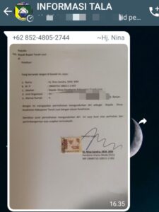 Informasi pengunduran diri itu disampaikan langsung Nina Sandra melalui pesan media sosial WhatsApp (WA) di grup Informasi Tala dengan mengirimkan foto surat pengajuan pengunduran dirinya pada Rabu (23/11) pukul 16. 35 WITA.