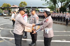 PENGHARGAAN – Kapolres Tala AKBP Ricky Boy Siallagan menyerahkan penghargaan kepada sejumlah personel, Senin (13/4) pagi.