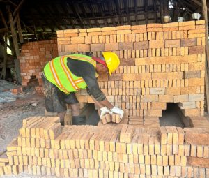 SAFETY – Pekerja di lokasi Usaha Batu Bata Soimah Desa Telaga menggunakan APD melalui fasilitasi dan pendampingan Tim PKM Politala.